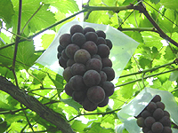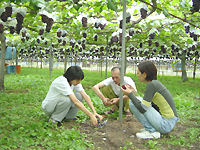 ![]() | 北澤さんの葡萄畑にも連れていってもらいました。高さが1.5mぐらいあって、ここで中腰で作業するのは大変ですね。 |