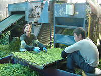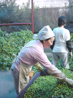 ![]() | これが「ホップ作業」。後ろの機械を使って、枝と葉を取り除いて、雌花だけにします。この日はたまたま台風が接近してて気温が低く、それでも汗びっしょりでしたが、普段はサウナ状態だそうです。 |