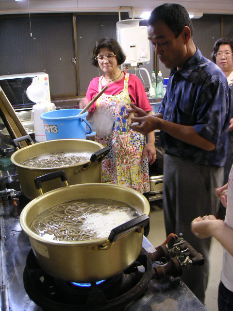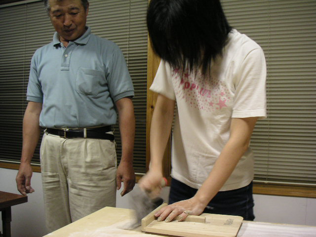 ![]() | 定規みたいなもので間隔をとりながら切っていくのですが、参加者のものはどうしても太くなりがちで、茹でるとさらに太くなるので、きし麺みたいになってました。 |