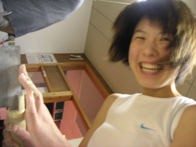 ![]() | 亀裂が入らないように気をつけながら、さらに薄くのばしていきます。 |