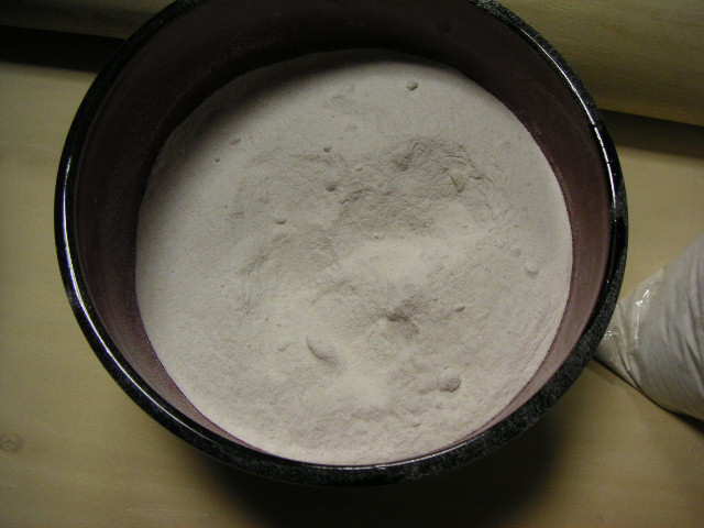![]() | 蕎麦粉に水を加えていきながらかき混ぜます。