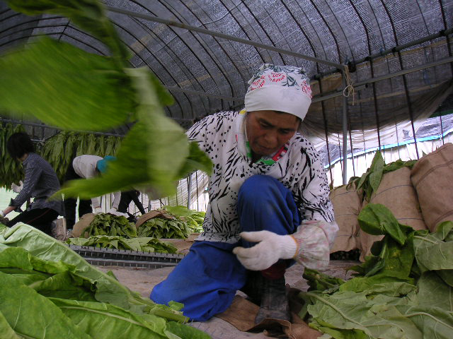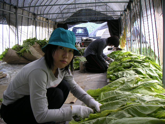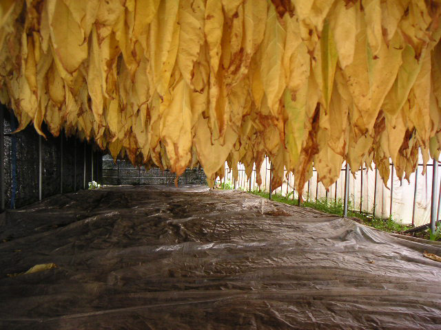 ![]() | 午後も同じ作業。午前中は男の子が外、女の子が中の作業だったので、午後は交代です。摘んだ葉は、最初にビニールハウスで干した後、暖房をきかせているこの部屋に移してさらに乾燥させるわけです。この部屋はニコチン臭が相当きつく、私はタバコを吸わないので、数分でちょっと気持ち悪くなりました。 |