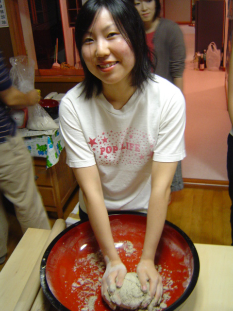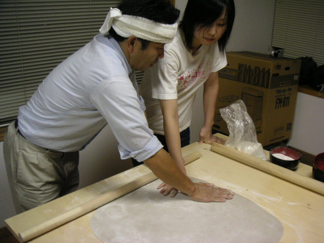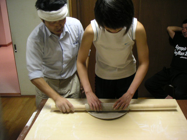 ![]() | 水を加えてコネた後、棒で伸ばしていきます。左の鉢巻の人はそば打ち名人の大風さん。 |