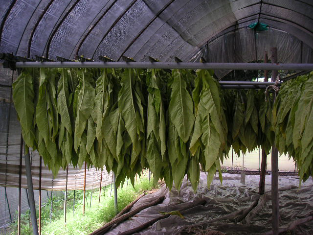 タバコをもりもり採って干す | ( 撮影・画像加工・文章・編集:貴山敬 ) |