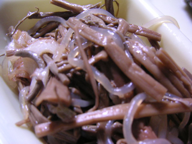 ![]() ![]() ![]() | 平吹さんのお宅でお昼を頂きました。左から芋煮、菊の花のクルミあえ、ぜんまいの煮物。 |