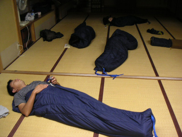 ![]() | 今回は地元の方に寝袋を貸して頂いて、公民館宿泊です。宴会が終わってみんなが寝静まった後、地元の方と1時間ぐらい話してから私が部屋にいくと、イモムシのようにもぞもぞしてました。 |