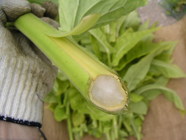 ![]() | これがタバコ畑。高いもので2メートルぐらいあるでしょうか。 ここは上山市狸森(むじなもり)の菅(すげ)地区。この地区の戸数はわずか5軒です。 |