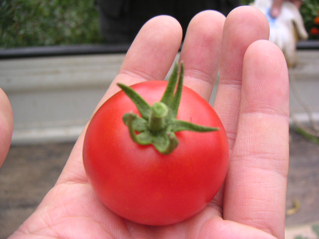 ![]() | 今そこで、もいできたトマト。美味しくないはずがありませんね。 |