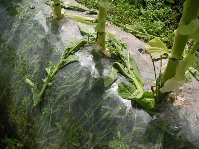 ![]() | こうやってビニールで覆う事で、雑草の発育を防ぎます。 |
