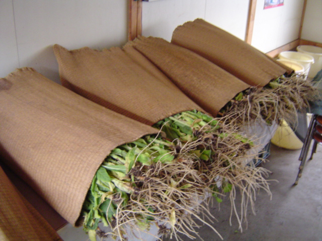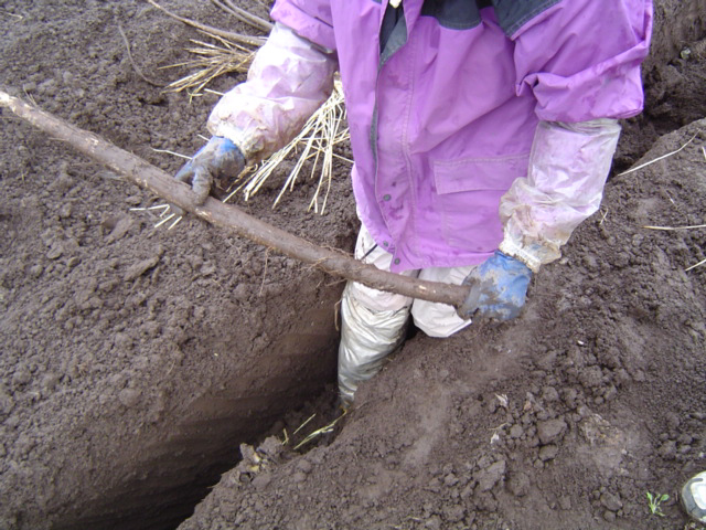 ![]() | 午後の作業に入る前に、鏡さんの奥さんがゴボウ抜きをしてらっしゃると聞いて、その様子を見に行く事にしました。 これは山芋。本当は山芋やゴボウ抜きのお仕事をする予定でしたが、この日はあいにくの雨だったため、鏡さんのご配慮で回避。雨で土が柔らなくなるとしんどさが倍だそうです。