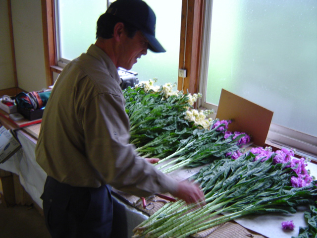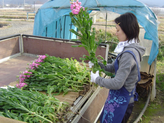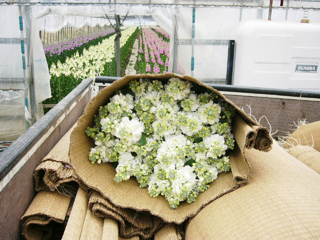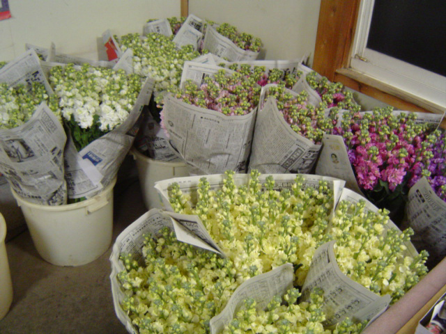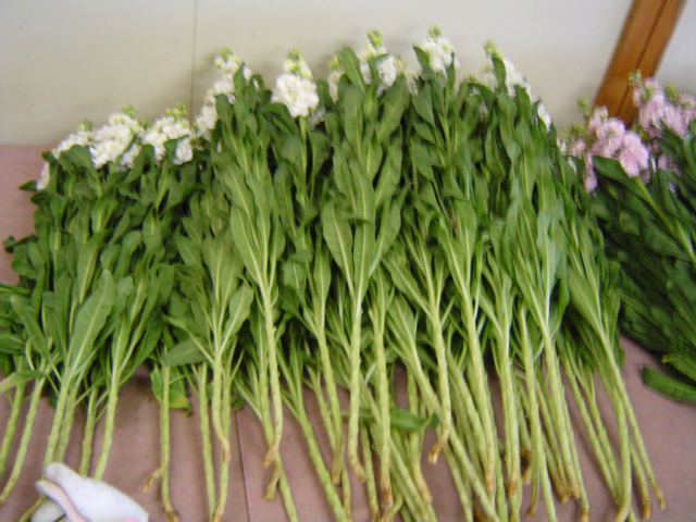 ![]() | 午後は、午前中に摘み取った花の「下葉取り」作業です。この写真は、午前中摘み取ったストックを、束ねて作業場に運び込んだ状態です。当然枝の下の方まで葉っぱが生えているのですが、出荷用に、下から1/3くらいの葉っぱをはがす作業をします。