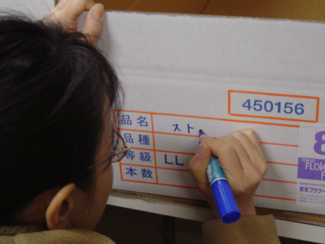 ![]() | 鏡さんが束ね作業をしている間に、出荷用の箱作り。翌日この箱に詰められて、農協を経由し、2日後の早朝には千葉・葛西の市場に競りにかかります。