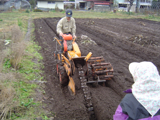 ![]() | ゴボウ抜き開始。まず、ゴボウが植わっている通りを、機械で掘っていきます。