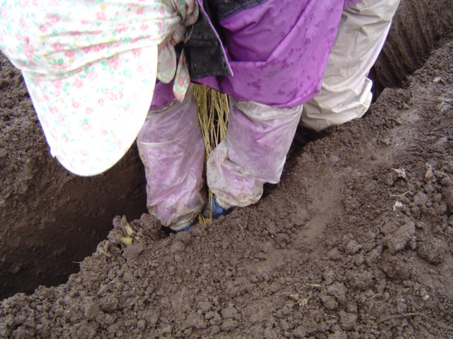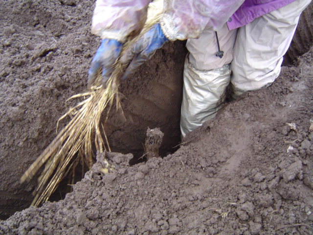 ![]() | 鏡さんの奥さんが、掘った穴に入り、ゴボウ探し当て、引っこ抜いていきます。手に持っている藁は、滑り止め。ゴボウはかなりすべるそうです。