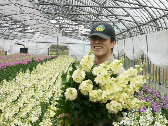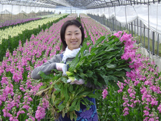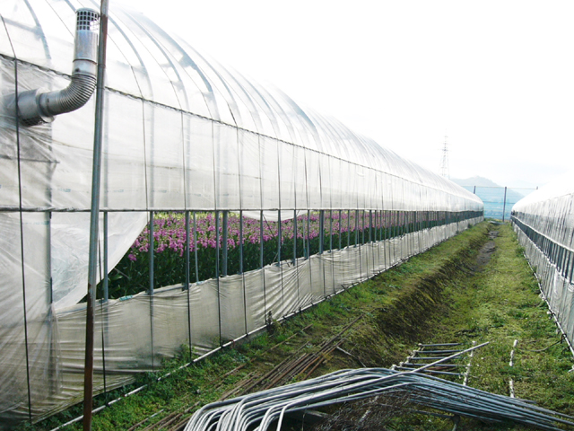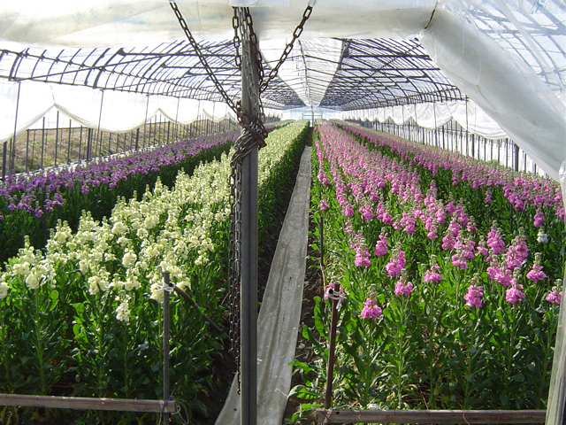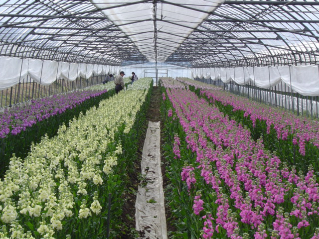![]() | 奥行が80mもある3つのハウスにストック、トルコギギョウ、デルフォニウムを栽培。毎朝ハウス内に冷たい空気を入れるために、ハウスを開けにくるそう!