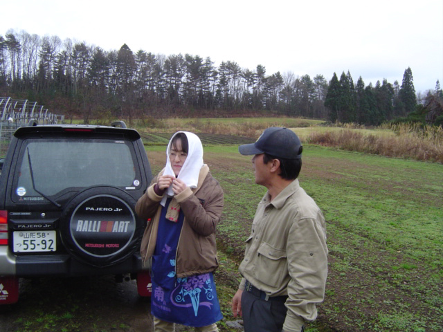 ![]() | 昼食後、翌日のランチ用の野菜を取りに、鏡さんの野菜畑に行きました。 蔵王連邦が望め、人工物の音がしない、静かな場所。 ただいまのところこの畑で取れる白菜、キャベツ、ブロッコリーなどは、ほとんど自家用だとか。どの野菜もめちゃうまだったので、いま思えば、どっかり頂いてくれば良かったス。
