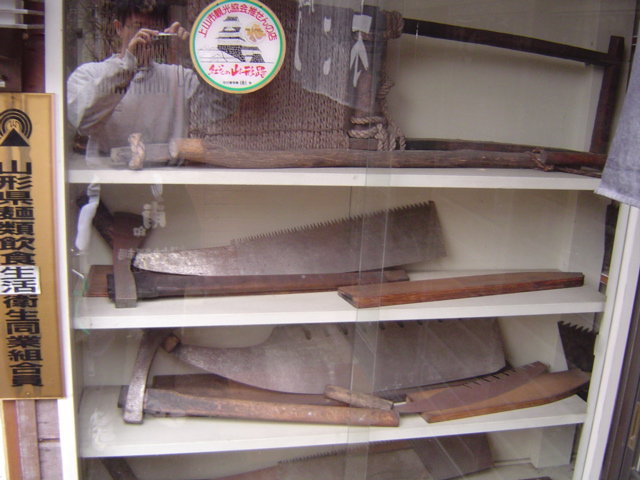 ![]() | 店の玄関には、のこぎりの数々。きこりって本の世界でしか知りませんが、実際はこういう道具なんですね。
