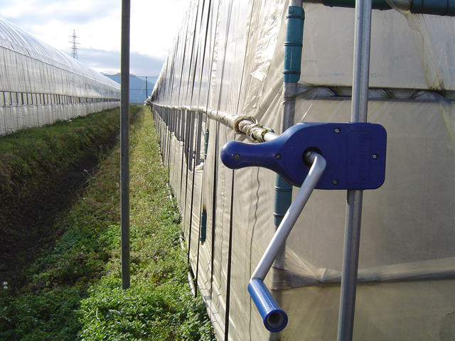 ![]() | ハウスの外側からレバーをまわすとハウスの側面が開いていきます。80mの奥行きがあるハウスですが、普通の力でレバー回せば向こうまできちんと開きます。