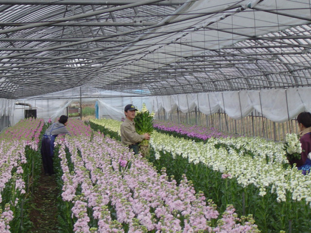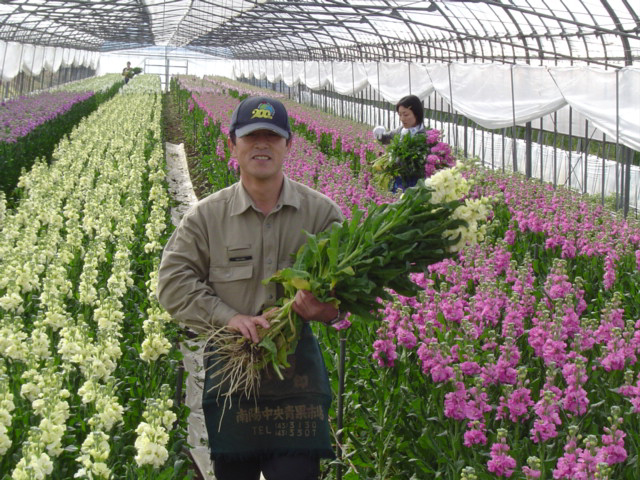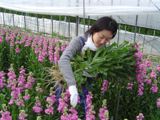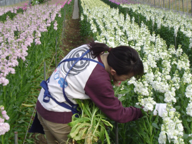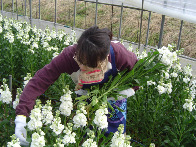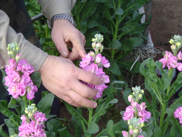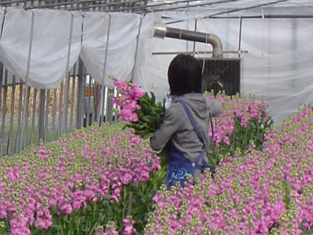 ![]() | こちらの参加者はピンクのストックをハウスの向こう側から。最初は、これ摘み取るべきか、摘み取るにはまだ早いか、かなり悩みます。 せっせ。せっせ。列の先頭からどんどん摘みとり、左腕で抱えきれなくなったら、トラックに運びます。