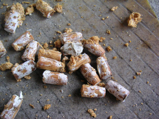 ![]() | 午後は椎茸のコマ打ちです。「コマ打ち」とは、茸の菌糸がつまった「コマ」(左の写真)を山から切り出してきた材木に打ち込む作業の事で、田舎時間企画では過去に何度かやっています。 山元でやったコマ打ち(2002年10月) 姥懐でやったコマ打ち(2003年4月) |