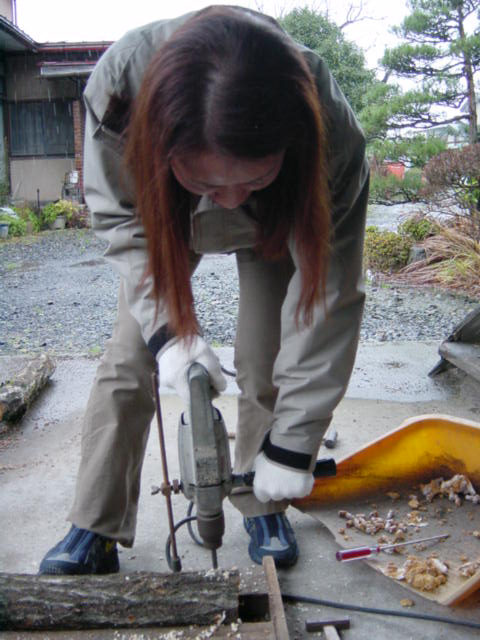 ![]() | コマを金づちで打ち込みます。これで1年後ぐらいにキノコが出てきます。3年間ぐらいは出てくるそうです。 |