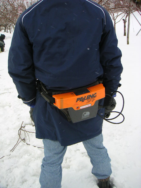 ![]() | 須田さんのところでは、大きい枝や曲がった枝は、集める時に面倒なので、自動鋏で切っていきます。 バッテリーを腰に巻いて(結構重い)、 |