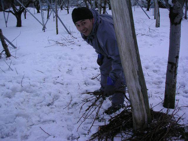 ![]() | やっぱりせっかく来たのに作業なしというのも残念なので、雪の中でも剪定作業をする須田さんについていって、1時間だけラフランス畑での枝拾い作業に出発です。 |