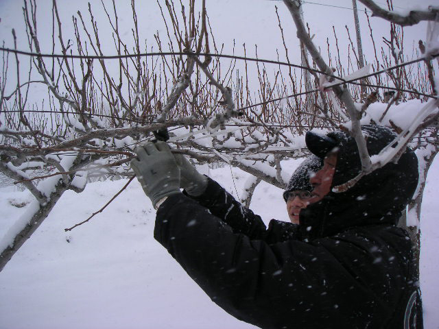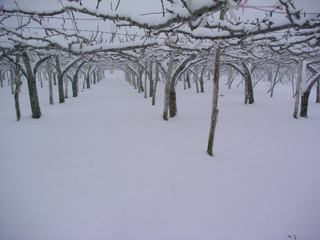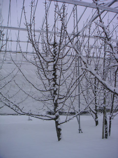 ![]() | この日は寒いし吹雪いていて、予定していたラフランス畑での枝拾いができませんでした。畑の見学です。 |