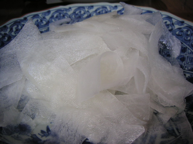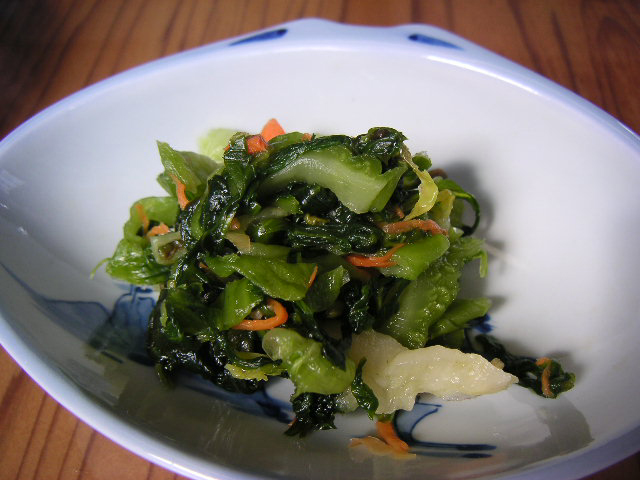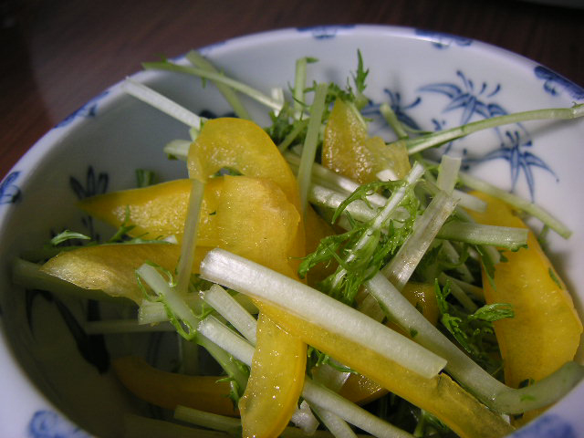 ![]() ![]() ![]() | 須田さんのお宅でお昼を頂きました。左から、さっき掘り出したシャブシャブ用(!)大根、最近人気の「水菜」のサラダ、おみ漬け。 |