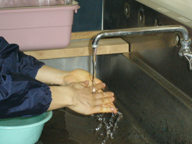 | 休憩の宴は納屋で開かれた。参加者は泥で汚れた手袋を取ると備え付けの蛇口からの水で手を洗う。手を洗っていると鏡さんがいう。 |