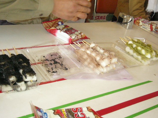 | さておやつの時間を迎えたものの、実は参加者は皆まだおなかが然程空いていなかった。というのも昼食は昼食を盛大に振舞われた上に、かしわ餅やゆべしなどの甘味も食していたから。しかしおやつの席にはアイスクリームと団子が用意されていた。ゴマと胡桃と枝豆の団子。一同少々戸惑いながらも、その厚意を受けてパクっ(団子3姉妹)。満腹の上山は続く。 | ![]() ![]() ![]() ![]() |