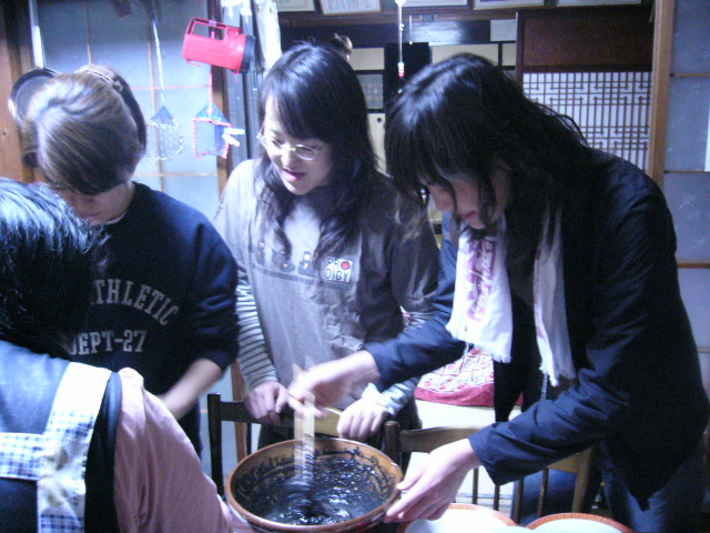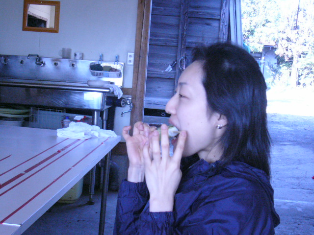 | 中に入るとすでに冨士班のメンバーは食事の準備を大概済んでいた。鏡班のメンバーを冨士さんへ紹介しおえると、冨士さんが用意してくれていた餅に皆でタレを和えていよいよ食事に移る。 | ![]() ![]() |