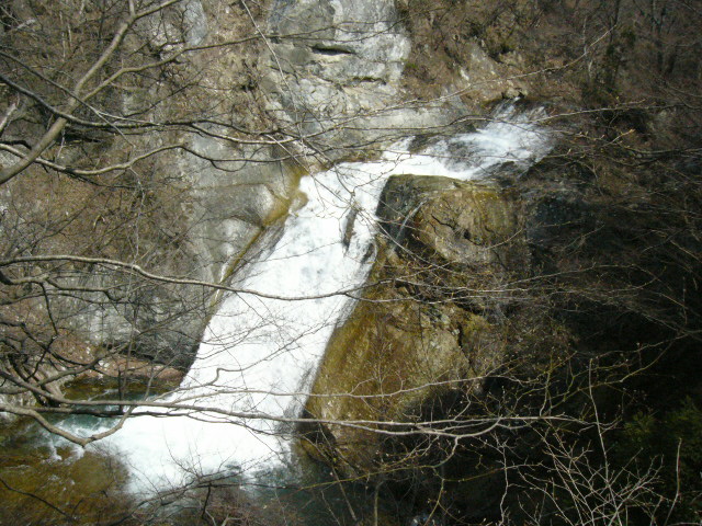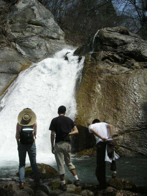 | 滝は上から見下ろすような形でみることができたが、急勾配を下れば滝壺まで行くことができる。あまり整備されていない山道を恐る恐る下っていき滝壺につく。マイナスイオンが辺りに充満している。これまで何度となく訪れている貴山さんが水かさの多さに驚いている。なるほど、雪解け水。ここにも自然の摂理が。 | ![]() ![]() |