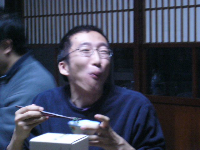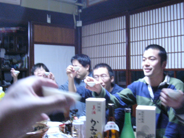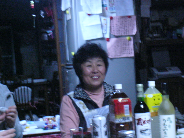 | 冨士家は普段は4世代の集まる賑やかな大家族だというが、この日はご主人とご子息が東京出張をしており、それに伴いご子息のお嫁さんと子供たちがお嫁さんの実家にいってしまっていた。よって宴はお母さんとそのご両親。それに加え二人の井上さんら町の人たち4名、鏡班の4名、そして冨士班の3名、Yちゃん、Iさん、貴山さんの総勢14名だった。 |