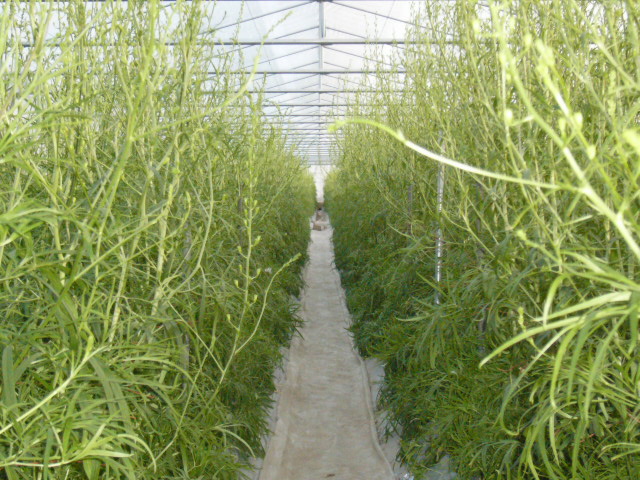 | 隣のハウスはデルフォニウムの花。丈が長く綺麗に花が鈴なるので、最近ウェディングなどで人気が出てきている花だという。ハウスに入ると、花を咲かせる前のデルフォニウムが一面生い茂っていた。中に進んでいくにつれ、にわかに隣にいた参加者のOさんの表情が晴れていったのに気付いた。実はこのOさん、昨年の12月の田舎時間でまさにこのハウスのデルフォニウムの植え付け作業を行っていたのだった。 | ![]() |