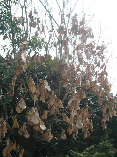 | 「あそこに柏の木があるの見える?電信柱の後ろの葉っぱが全部枯れて茶色くなっているやつ。あれが柏の木なんだね。柏の木は葉が枯れても次の芽がでてくるまでずっと葉が落ちないでそのままでいるんだね」 | ![]() |