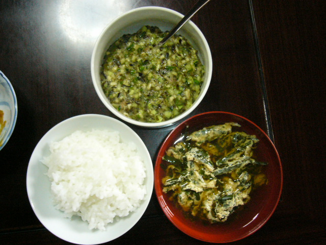 | 昼食のメニューは以下のとおり。 ご飯(白米)、おすまし(韮のたまごとじ入り)、エビフライ、だし、オカヒジキ、うるい、たまこんにゃく、そして生の胡瓜。エビフライ以外は全て、地元で採れたもの。昼から相当なご馳走だ。この中の「だし」は胡瓜、ナス、長芋、茗荷のみじん切りを出し汁で和えたもの。納豆やとろろなどのようにご飯にかけて食べる。美味。たまこんにゃくがあんなにも出汁の味を染み込むのか、と驚く。 |