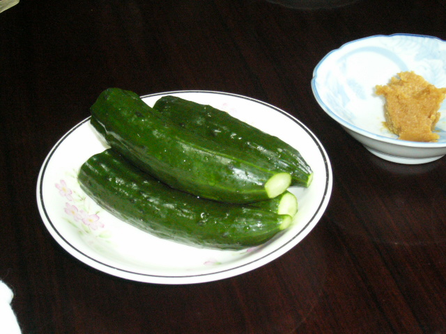 | もぎたての新鮮な胡瓜。イメージしていたのはカリっとしたハリのある食感。しかし味噌をつけて実際に齧った胡瓜の皮は存外柔らかく、カリっといったような感じではない。弾力をもってしなった皮がはじけると、中からは瑞々しい果肉が口に広がっていく、という感じだ。濃い。とにかく味が濃密だ。エッセンスが凝縮されているような感じ。きっと辞書に胡瓜の味、というのを載せなければいかないのだったらこれが見本になるであろう、というような味だ。無意味な水っぽさがなく、ただただ胡瓜。鏡さんが私たちに食べさせたくて、わざわざ買って来てくれたのも頷けた。 |