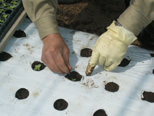 | 今回われわれが植え付けをするのはトルコキギョウ。リンドウ科の可憐な花で、8月の誕生花としても知られている。植え付けの方法自体は簡単だ。畑上に被せられているビニールの植えるべき箇所にはすでに丸く切り抜かれ土が顔を覗かせている。その中央に指で程よい穴を開け、そしてピンセットで苗床から取り出した苗を植えていくだけの作業だ。 | ![]() ![]() |