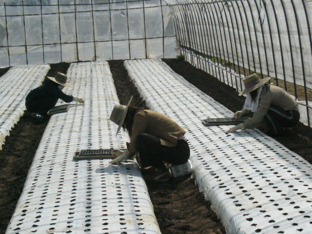 | 作業自体はとりわけ難しいわけではない。しかし、しゃがんだままずっと腰を曲げて行うその作業の負荷はジワジワと腰にくる。トルコキギョウだけで年間3万本以上の植え付けを行うという。気の遠くなるような作業だ。しかし私たちの午前中の作業は畑に水を撒き(土が乾燥しすぎていたため、指で空けたそばから穴が崩れてしまったのだ)、簡単に練習だけをしただけで昼食の時間を迎えた。 | ![]() |