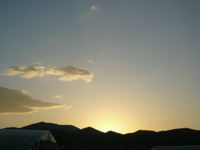 | 農作業の後はもう一つのホストファミリー、冨士さんのお宅で夕飯をご馳走になることになっていた。鏡さんとはここでお別れだ。最後再びKさんも一緒にデルフォニウム畑を見に行くと、鏡さんに別れを告げ井上さんの車に皆で乗り込む。落ちかけた夕日を背にしたビニールハウスに別れを告げる。 | ![]() |