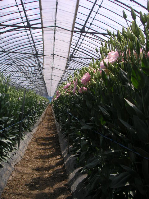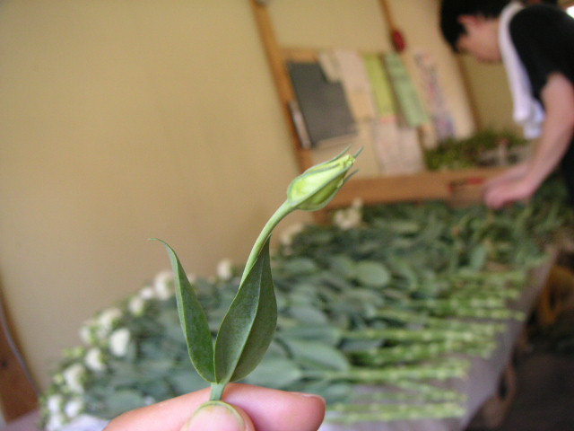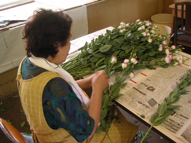 ![]() ![]() | メロンの定植作業が終わったら、トルコギキョウの出荷準備です。まず根っこを鋏で切ります。 |