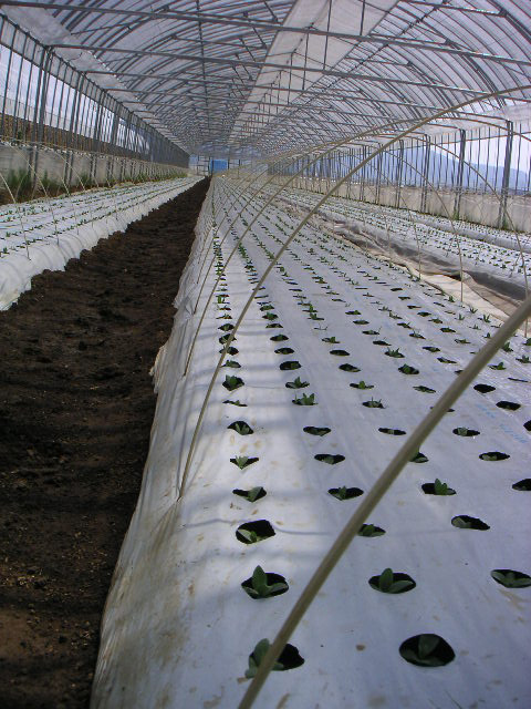 ![]() | 最後に土を平らにして終わり。平らにするのも重要で、でこぼこしてると確か水まきのときにうまく水を吸収しないとかなんとか。ハウスの中は40℃近くて汗だくだく。 |