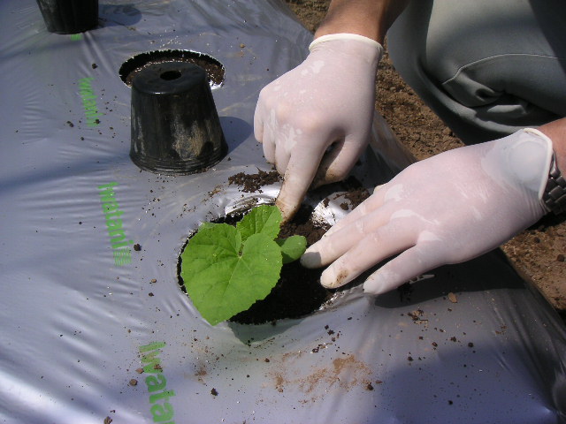 ![]() | 最初はメロン畑で苗植え作業(こういうのを定植といいます)。4月の参加者が堆肥を作った畑です。 まず穴を開けて、 |