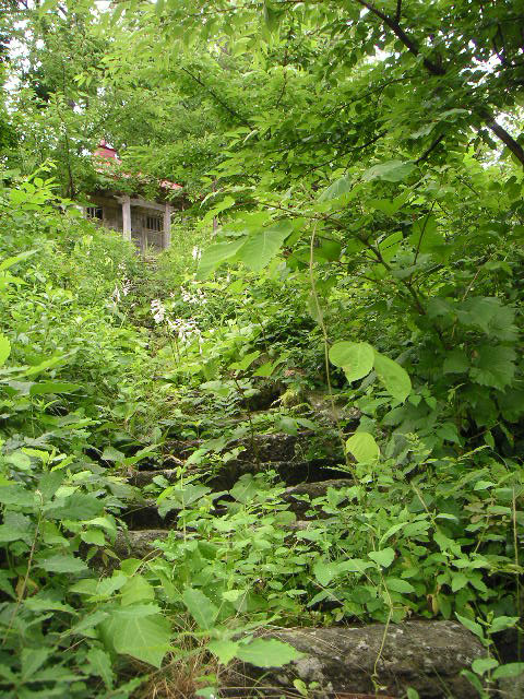 ![]() ![]() | 神社までの階段が夏草で覆われていました。 |
