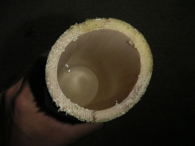 ![]() | 途中、田舎時間で過去2回受け入れて頂いた菅の平吹さん宅にお邪魔して、一服いただきました。つい先日、地区のお祭りがあったそうで、その時に使われたのがこれ。竹を切ってからしばらくすると水が出てくるそうです。実際に飲んで見ましたが、まさに竹水という味。 |