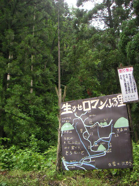 ![]() | 菅から狸森に向かって下ること自転車で5分ぐらい、平吹さんが20年前に制作したこの看板が大岩の目印です。 |