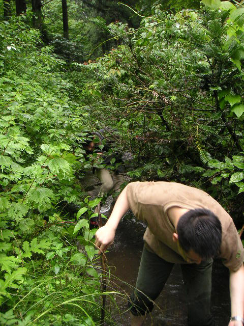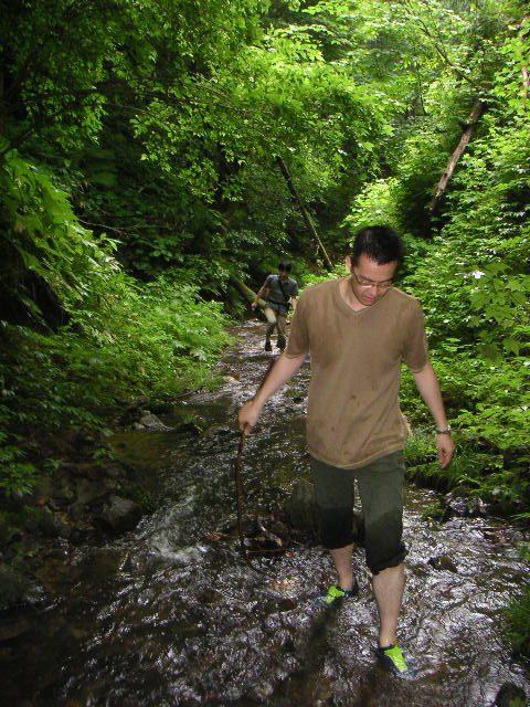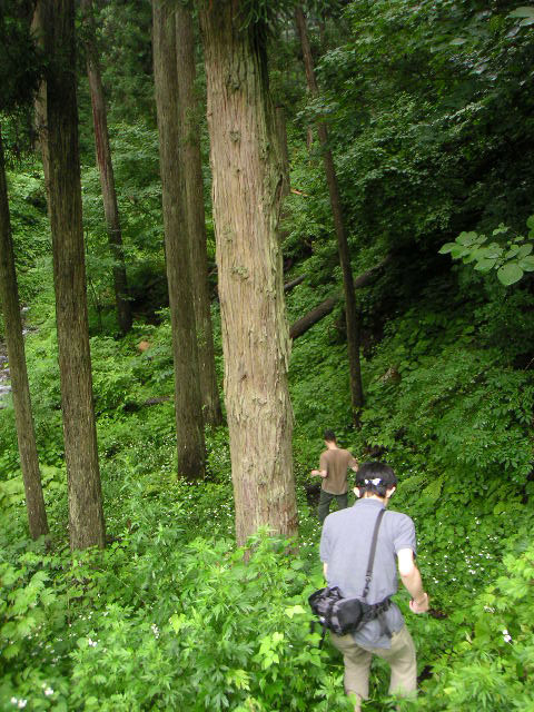 ![]() ![]() ![]() | 平吹さんが子供の頃はよくこの辺りで遊んだということですが、今は人が通った後は全くなく、蜘蛛の巣だらけで、川も深いところで膝まであるし、サバイバルな道のりでした。 |