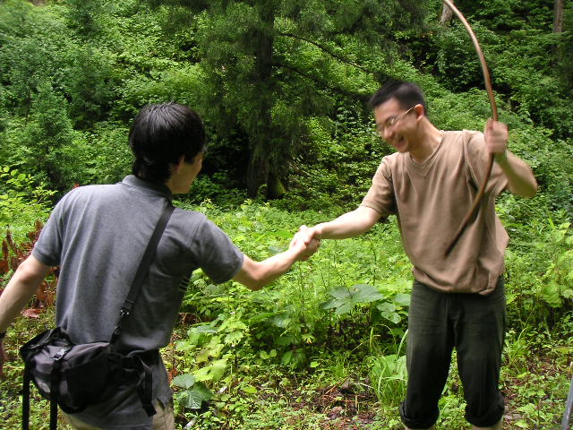 ![]() | 自転車のところまで生還してお互いの健闘を称えあう参加者。右の参加者が左手に持っている棒は蜘蛛の巣よけです。もう2度とあの滝のところまで行くことはないのでは、と思う一日でした。 |