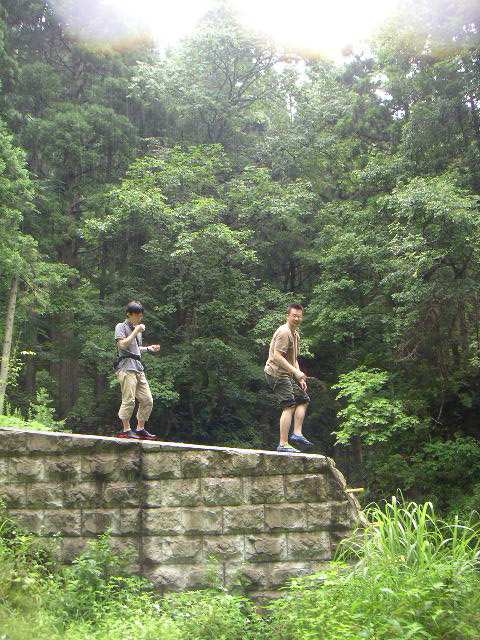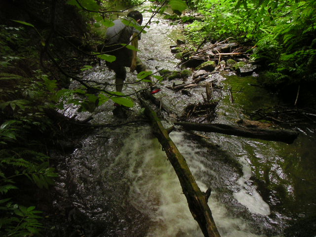 ![]() ![]() | 大岩のすぐ先に小さい堰があって、これを超えたらすぐに滝かと思っていたのですが、実はこの堰は4箇所ぐらいあり、その度に藪の中を回りこまないといけません。Tシャツ半ズボンにサンダルの我々は藪の中で擦り傷だらけでした。 |